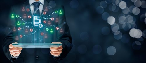 Corporate data management system (DMS) and document management system with privacy theme concept. Businessman or programmer with tablet and scheme with protected document connected with users, access rights symbolized by key.