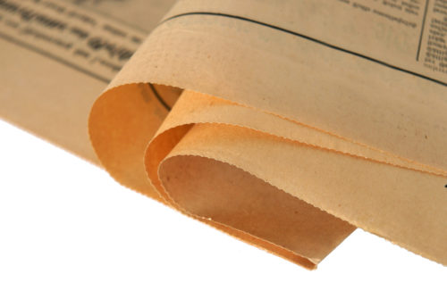 Fragment of a yellowed antique newspaper isolated on white background, a photo with a local focus